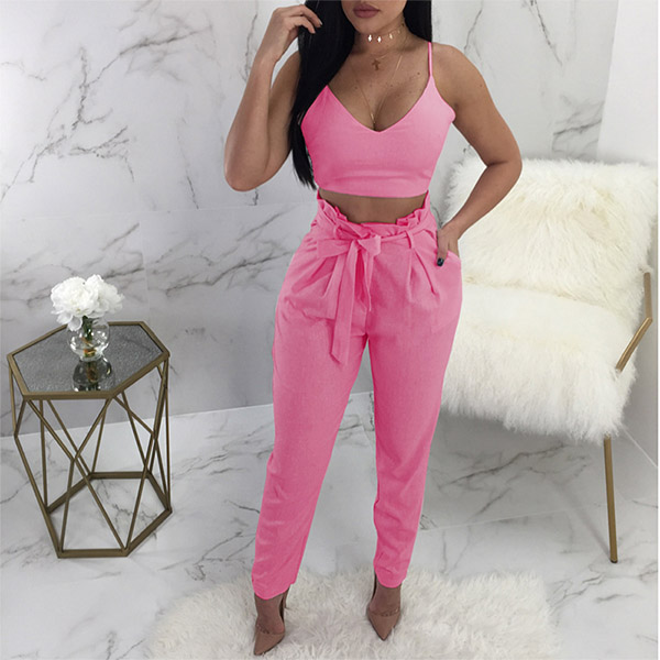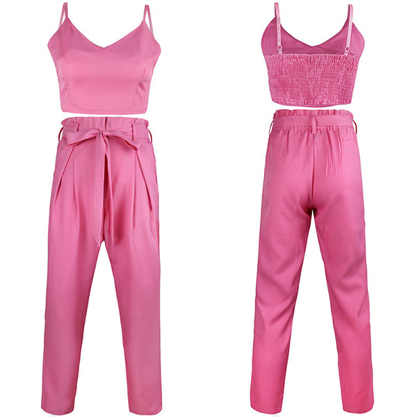 Comes with a sweet pink tone,including a backless v-neck sling crop top and a high waist pants,this two-piece