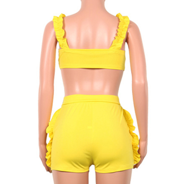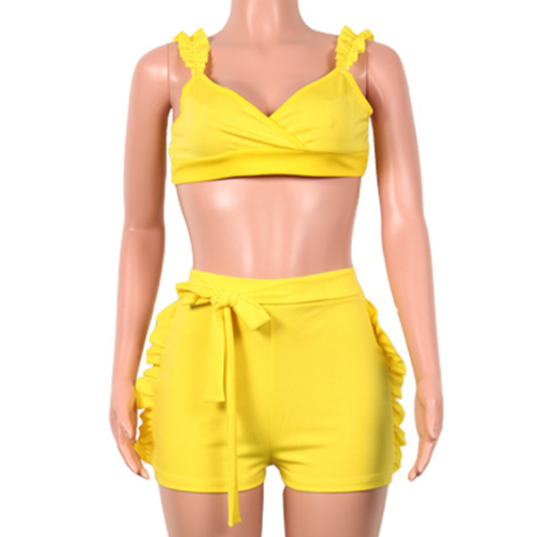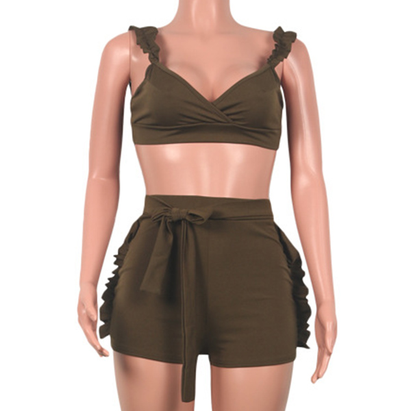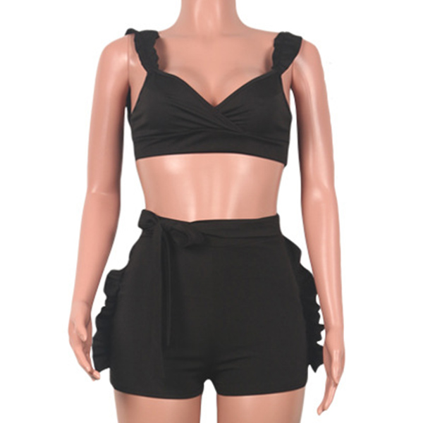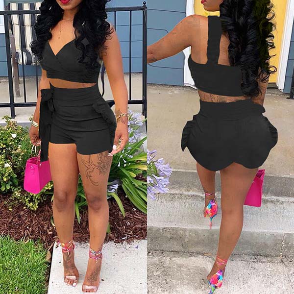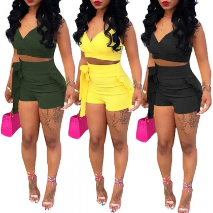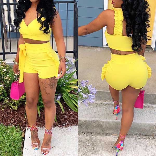 Solid color style,including a backless v-neck crop top and a high waist shorts,this two-piece set of course