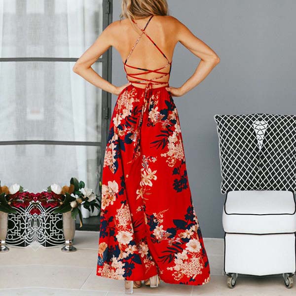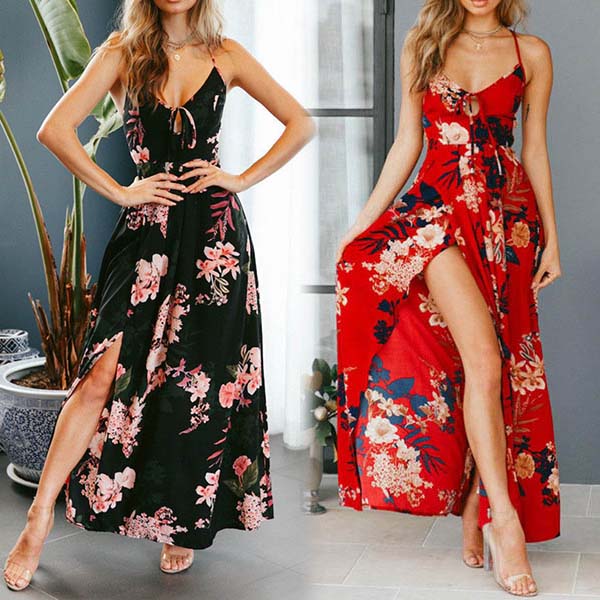 comes with vibrant floral print,with backless,v-neck and slit hem design,this dress can demonstrate your sexy