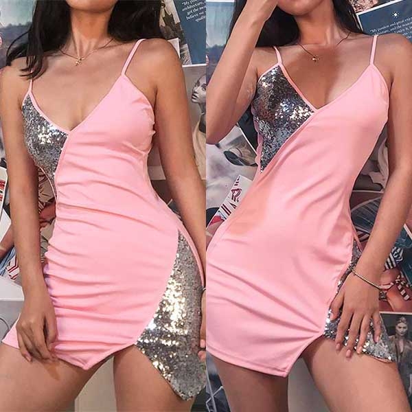 v-neck and slit hem design make this sling dress look so flirty. Moreover,the sequin spliced design can