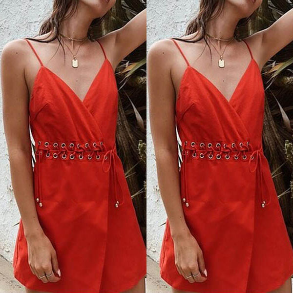 This dress comes with a bright and eye-catching red tone,which can help you win more eyes. Sling style,