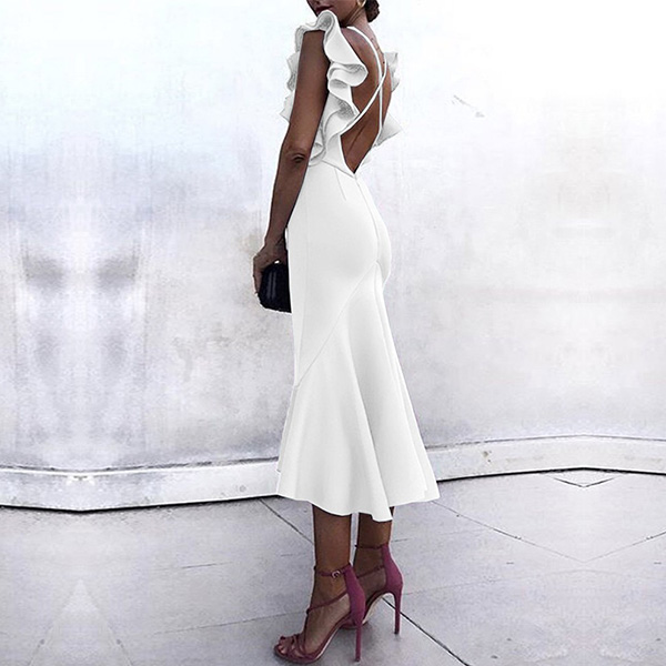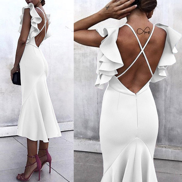 The solid color tone design can lend you a simple yet elegant vibe,while the backless,v-neck and ruffle
