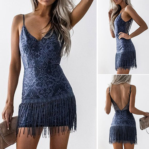 Sexy Backless V-neck Tassel Hem Printed Sling Dress