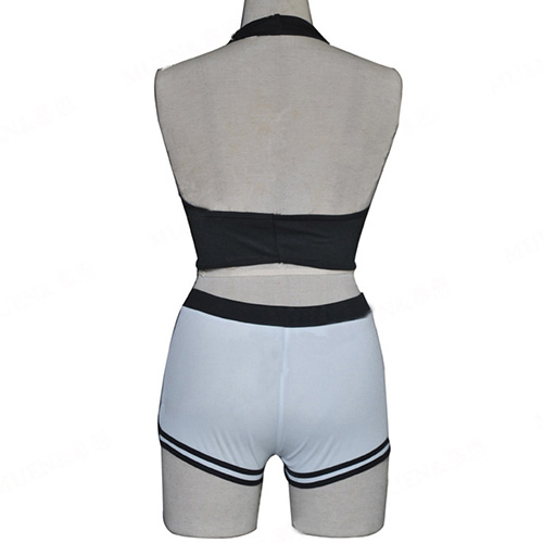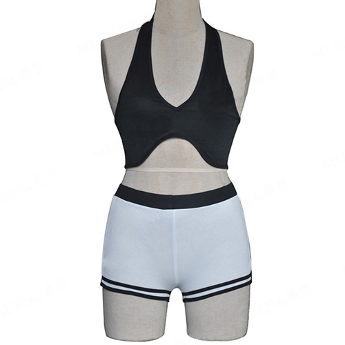 Two-piece style,including a black tops and a white shorts. Tops with backless and deep v-neck design.