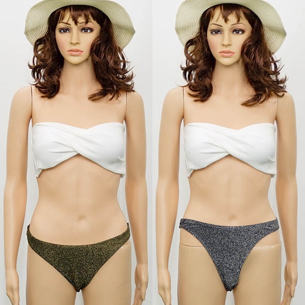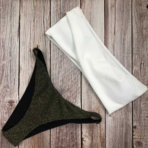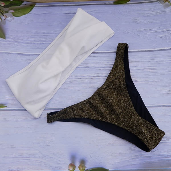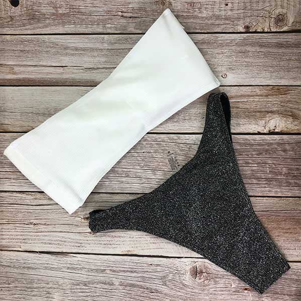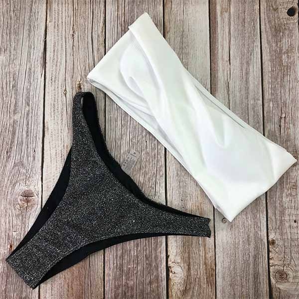 When head to the seaside,you can easily be the most attractive girl with this bikini set. It consists a bandeau bikini top and a low-waist shinning bikini bottom,which can