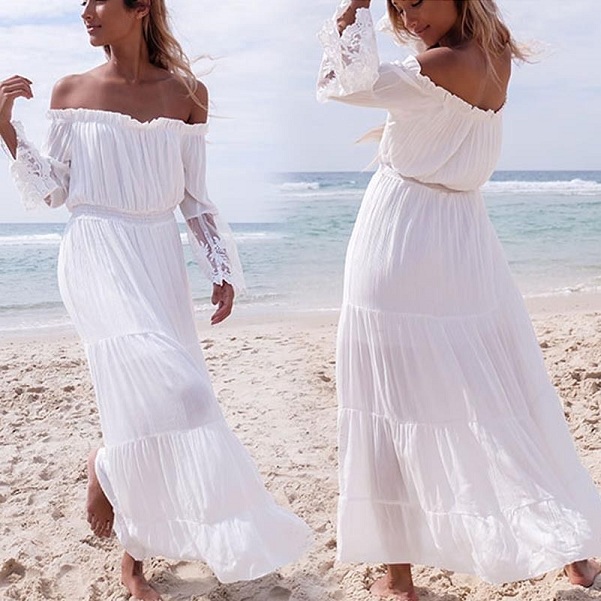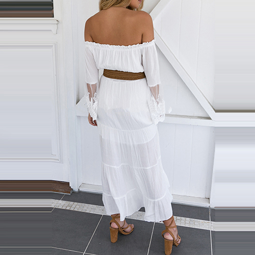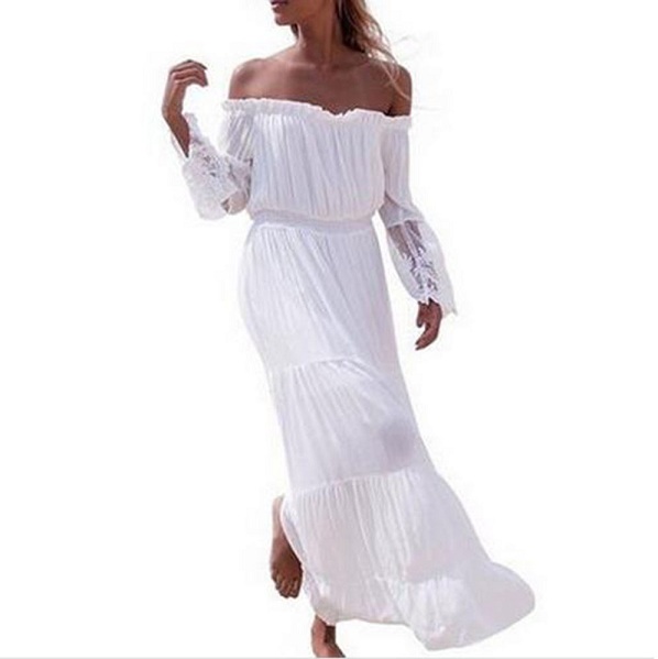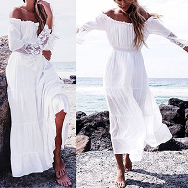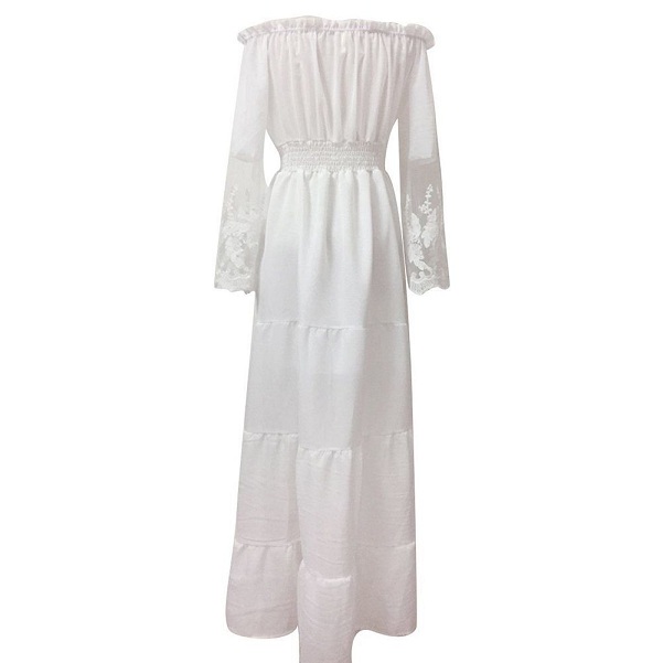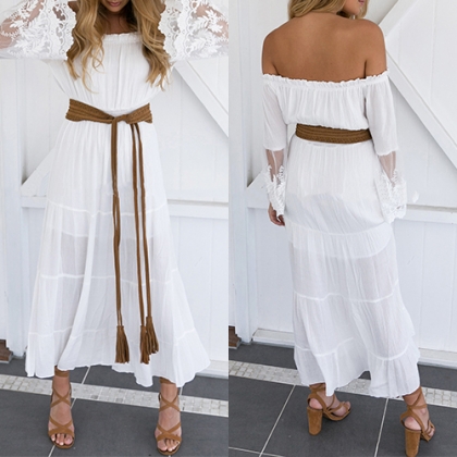 suggest you this dress? Designed with boat neck,lace spliced trumpet sleeve and a maxi length,this