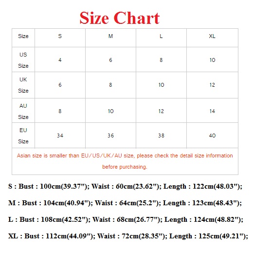 XL : Bust : 112cm(44.09"); Waist : 72cm(28.35"); Length : 125cm(49.21");