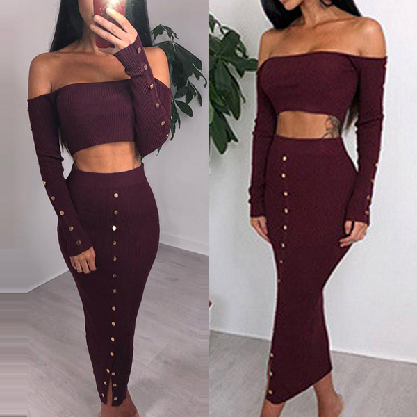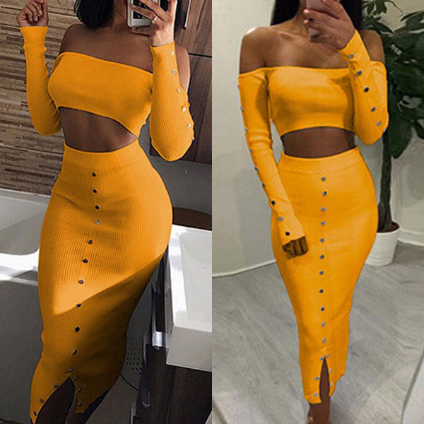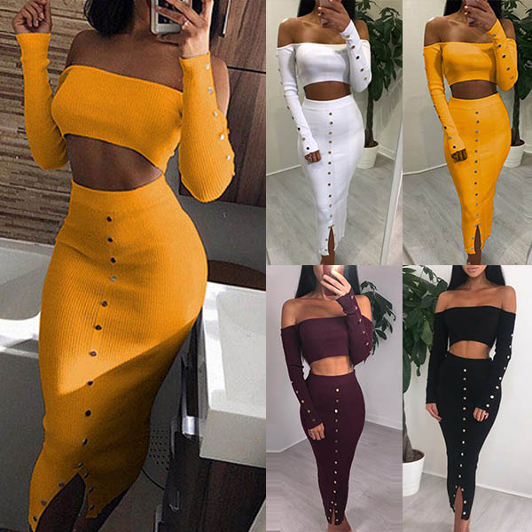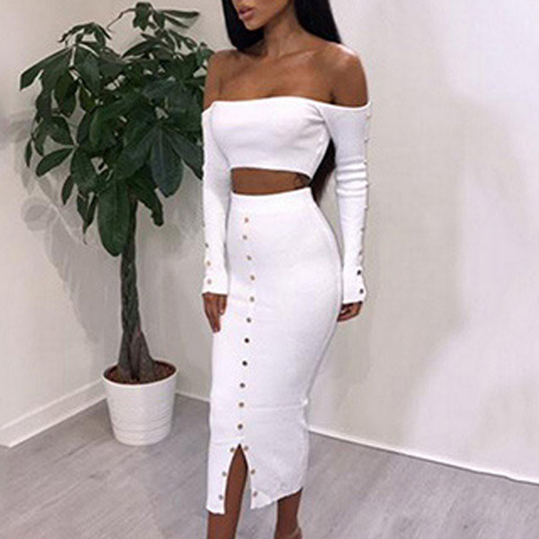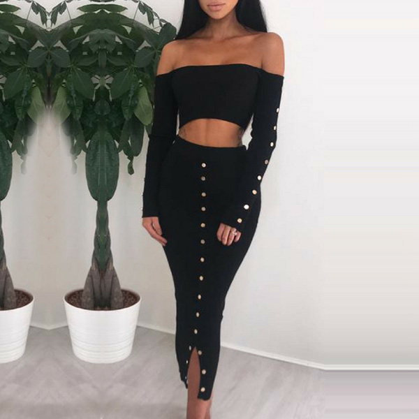 an off-shoulder long sleeve crop top and a high waist skirt,this two-piece set is a good chance to showcase