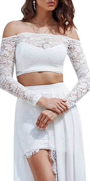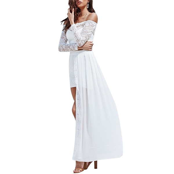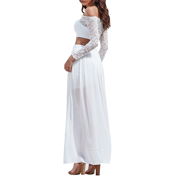Sexy Boat Neck Long Sleeve Lace Spliced Crop Top + Slit Hem Skirt Two-piece Set