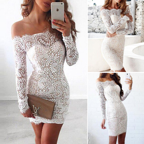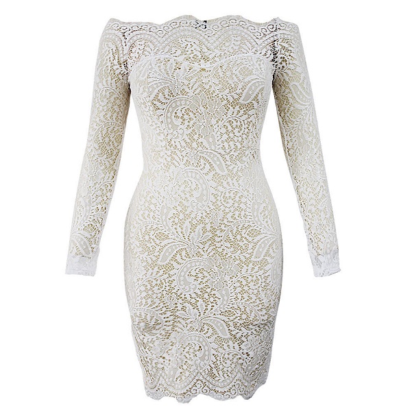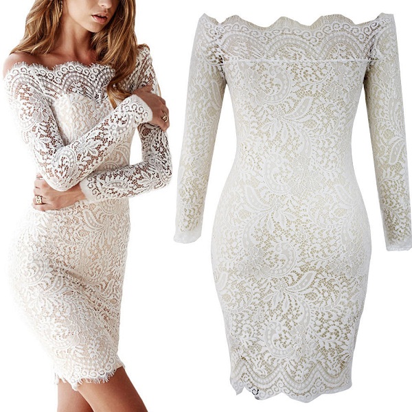 chance. This long sleeved lace dress is designed with an off-shoulder neckline and a fit silhouette,which