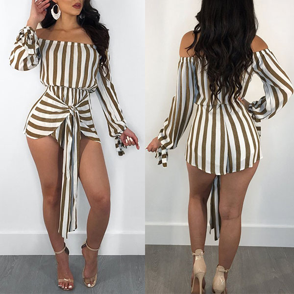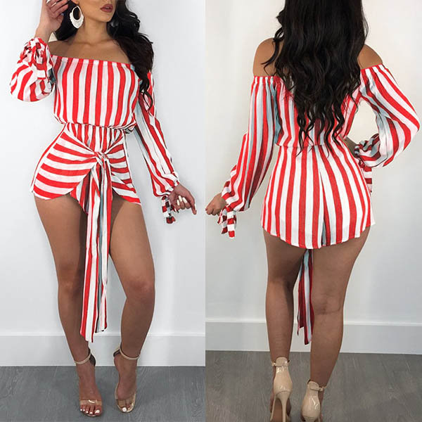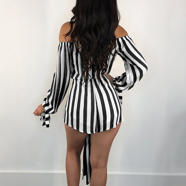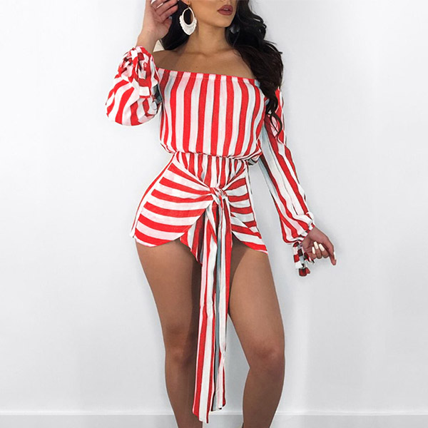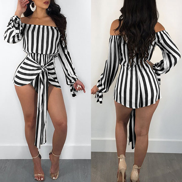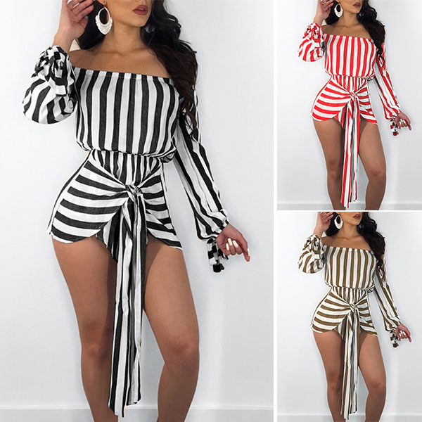 Sexy Boat-neck Long Sleeve Slim Fit Striped Irregular Hemline Jumpsuit