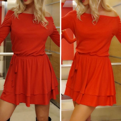red fabrication. Tailored with a boat neck,double-layer hem and lace-up waist,this dress