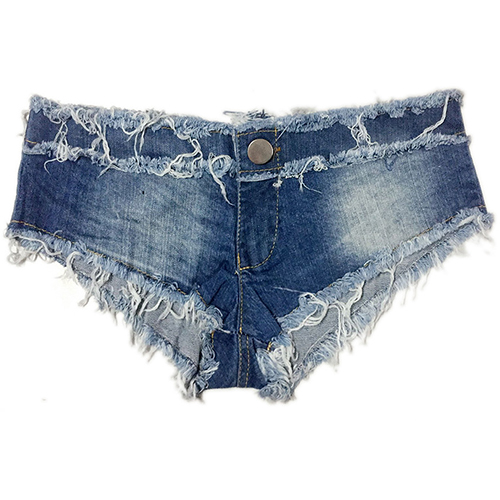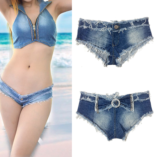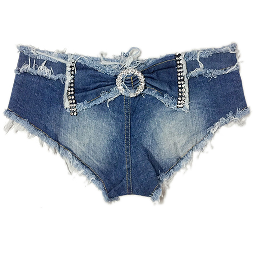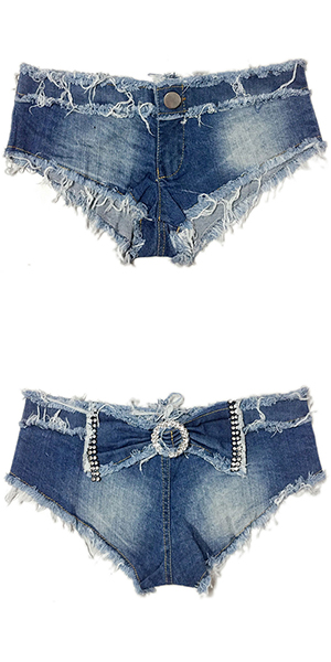 A sexy denim shorts featuring bow-knot on hip, deep low waist, zip fly with button closure.