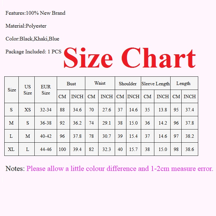 XL : Bust : 100cm(39.37"); Waist : 82cm(32.28"); Shoulder : 40cm(15.75"); Sleeve : 38cm(14.96"); Length : 98cm(38.58");