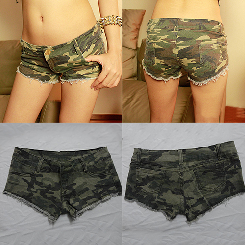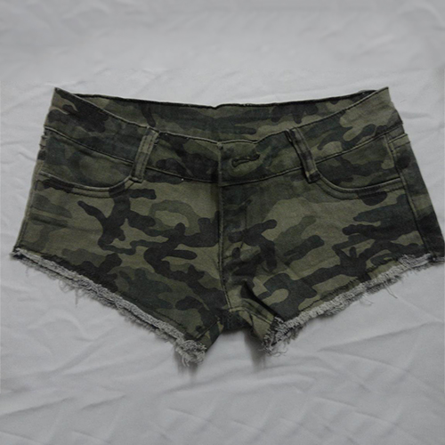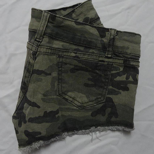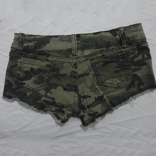 Make room in your wardrobe for this pair of low-rise denim shorts. It features camo print,