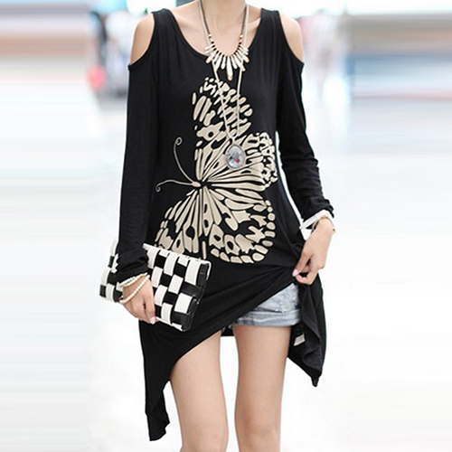 Sexy Cold-shoulder Sleeves Irregular Hem Printed T-shirt