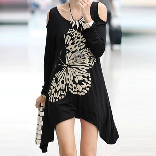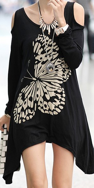 Boasting a butterfly pattern,vivid and chic. And its cold-shoulder sleeves and irregular