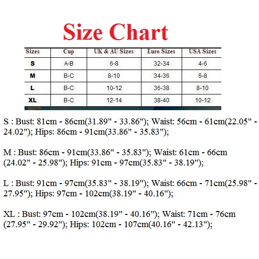 XL : Bust : 97cm - 102cm(38.19" - 40.16"); Waist : 71cm - 76cm(27.95" - 29.92"); Hips : 102cm - 107cm(40.16" - 42.13");