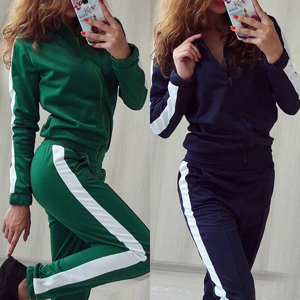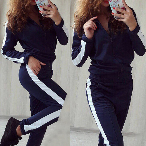 striped design,simple and concise. Crafted from soft and cozy fabric,this sports suit can keep you comfy all day.