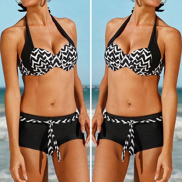 a low-waist panty,with contrast color printed details,this bikini set can bring you a happy and memorable beach trip.