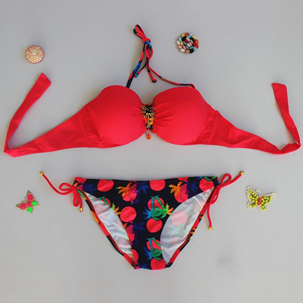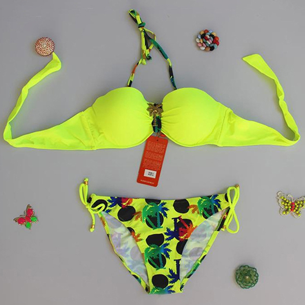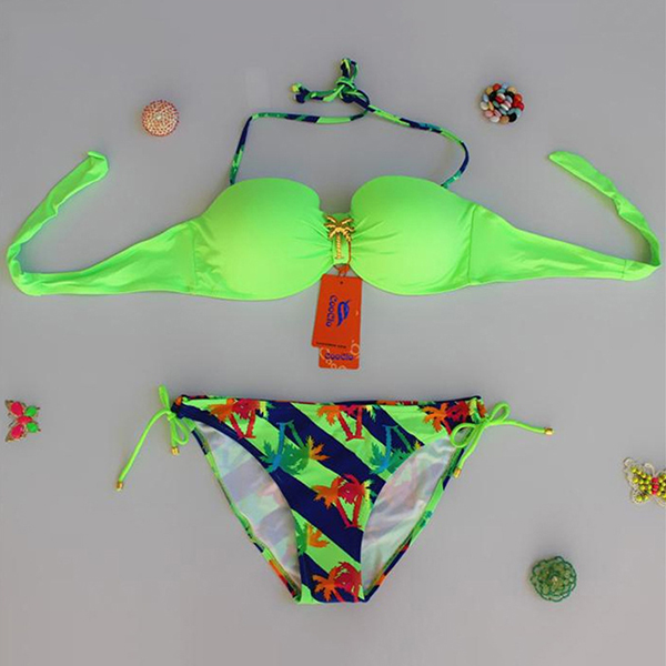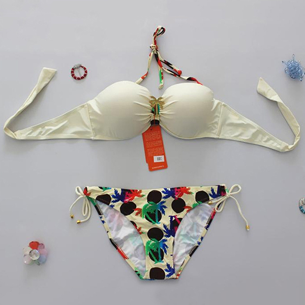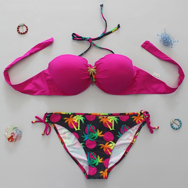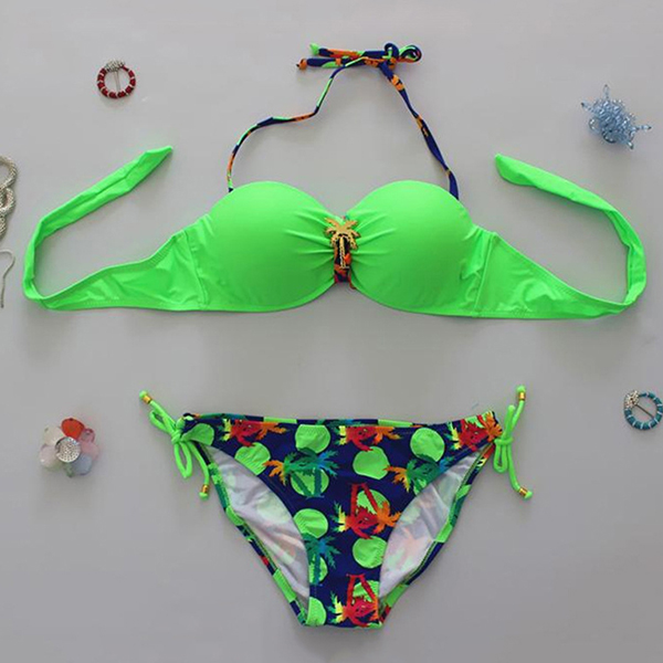 Keep your summer beach look charming and youthful with this bikini set. Its contrast color printed design makes it look