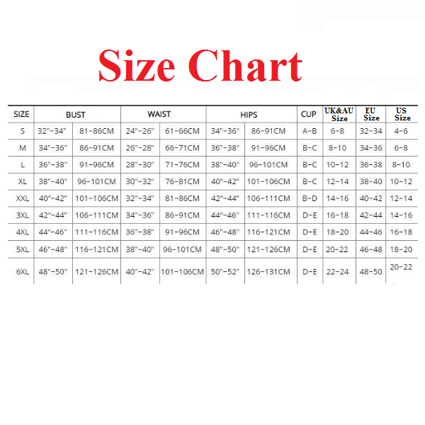 6XL(EU 48-50) : Bust : 121cm - 126cm(47.64" - 49.61"); Waist : 101cm - 106cm(39.76" - 41.73"); Hips : 126cm - 131cm(49.61" - 51.57"); Cup: D-E