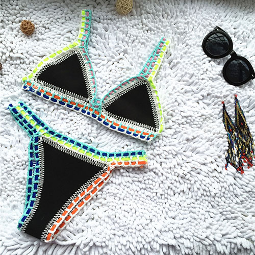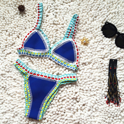 For a wisp of bright palette, look no further than this bikini set. It features color block design,