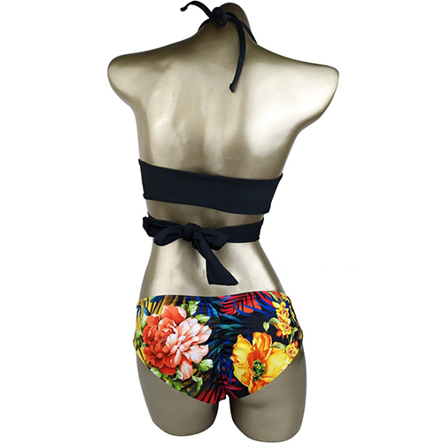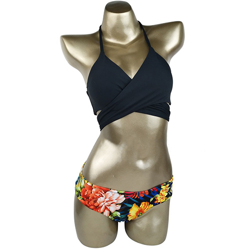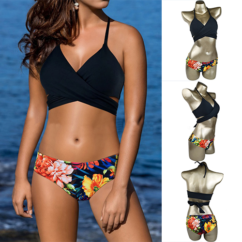 bikini set. Including a crossover black bra and a low-waist printed briefs,this bikini set will give you a happy beach trip.
