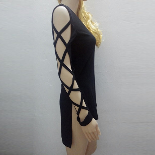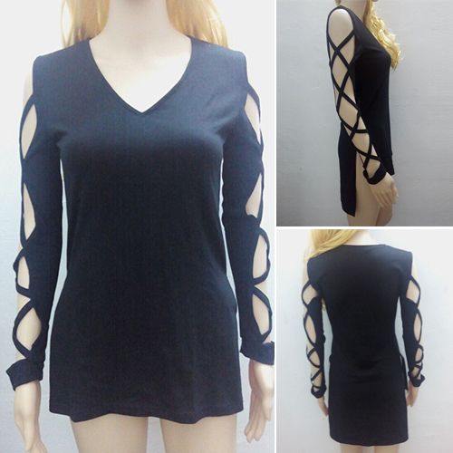 Wow,such a chic and unique t-shirt! Boasting a mysterious black color,its crossover hollow out long