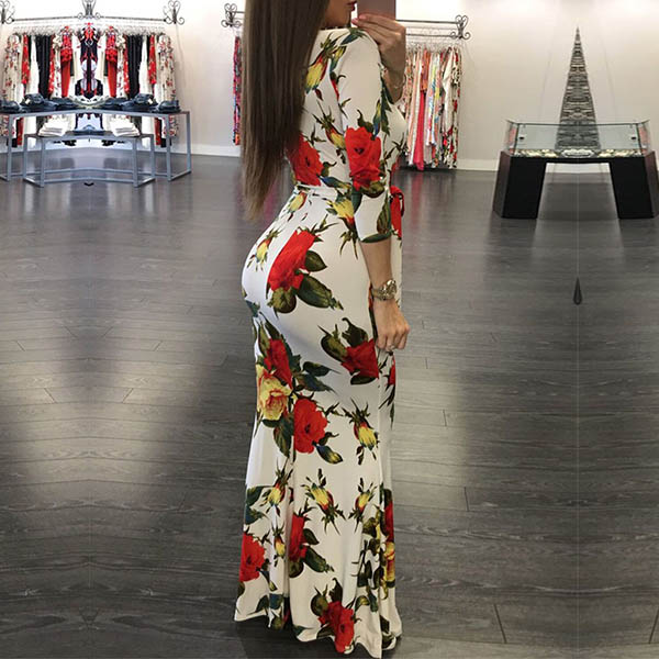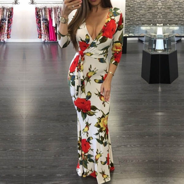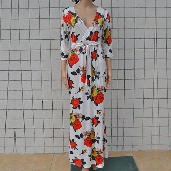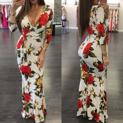 Designed with eye-catching printed pattern,3/4 sleeve,deep v-neck and a maxi length,