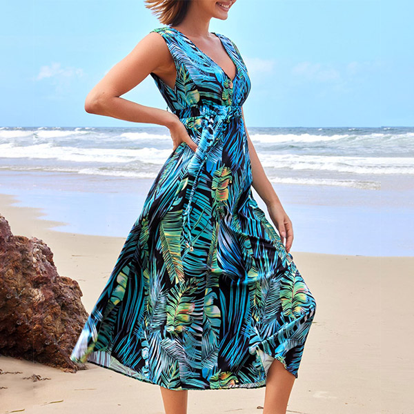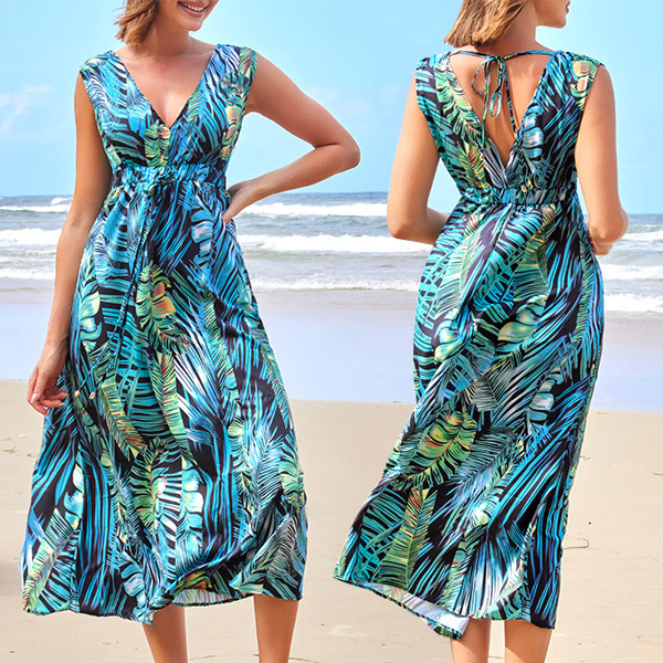 Sexy Deep V-neck 3/4 Sleeve Printed Maxi Dress