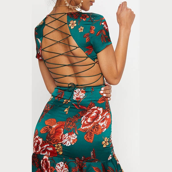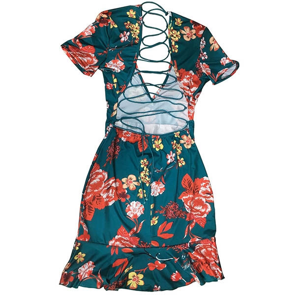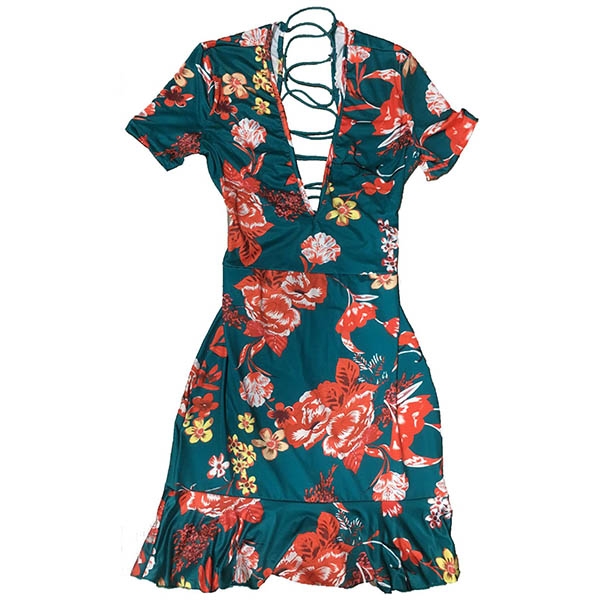 deep V-neckline and lace-up accent at back to channel sexy vibe, slightly ruffled trim at hem for a