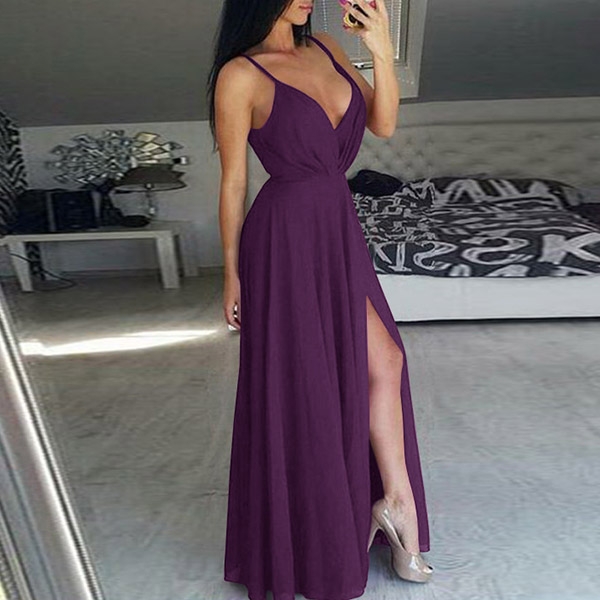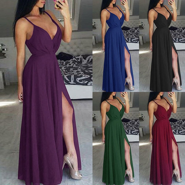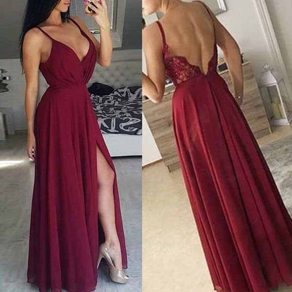 feature a fit-and-flare silhouette with deep V-neckline, high rise side slit hem, shoulder strap, backless,