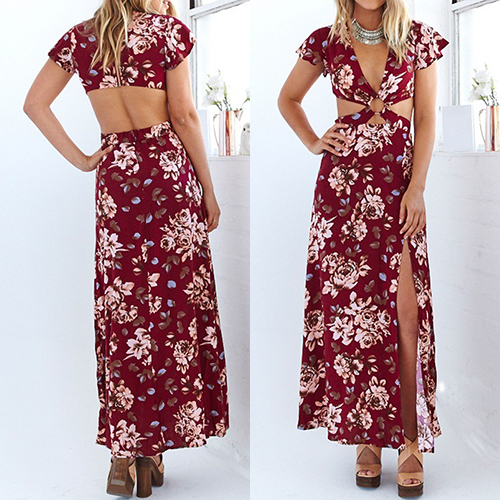 and sweet printed pattern,its backless,deep v-neck and slit hem design makes it look so sexy and sultry.