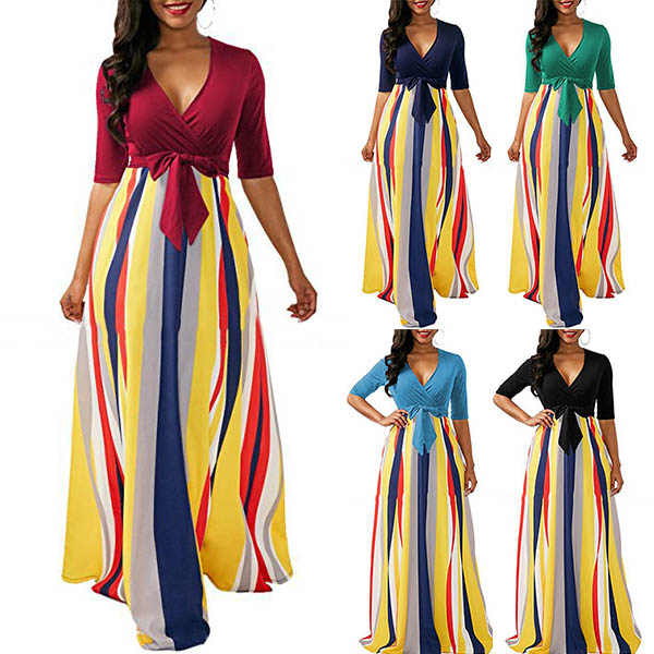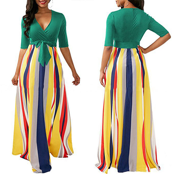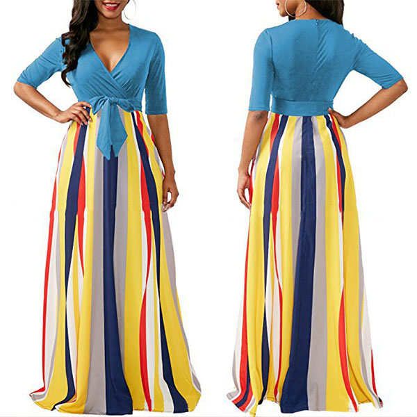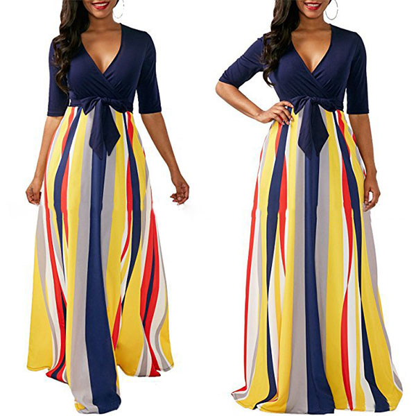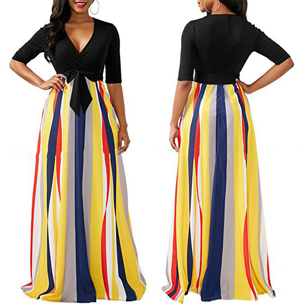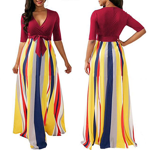 silhouette with a contrast color design, V-neckline, a muti-color stripe skirt, a self-tie design,
