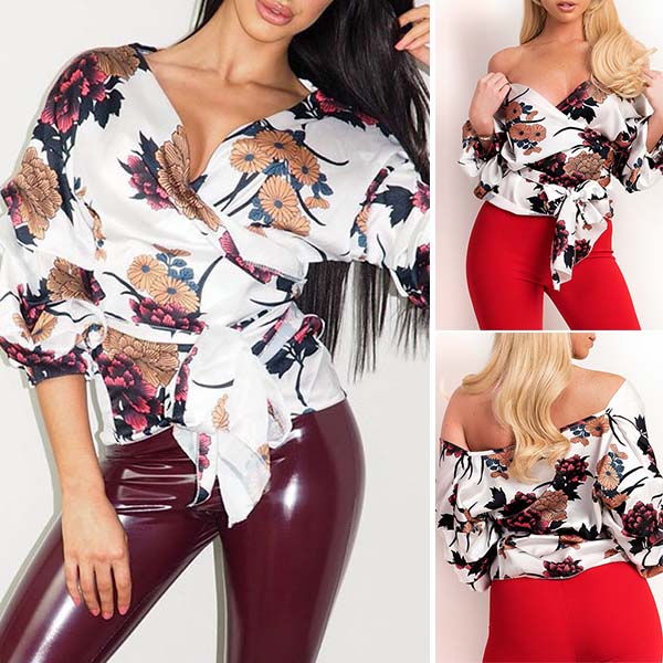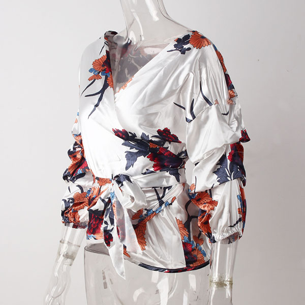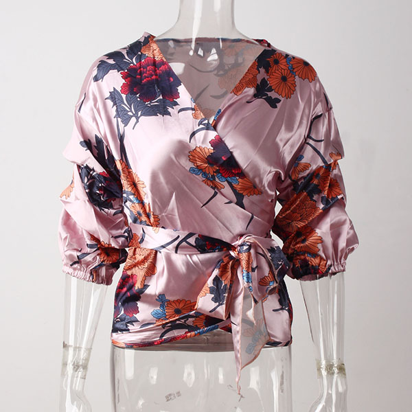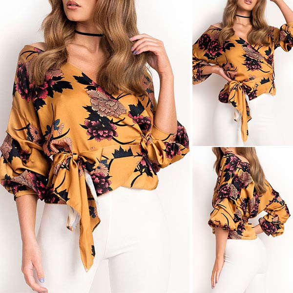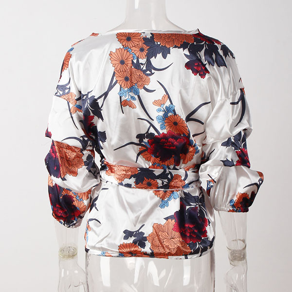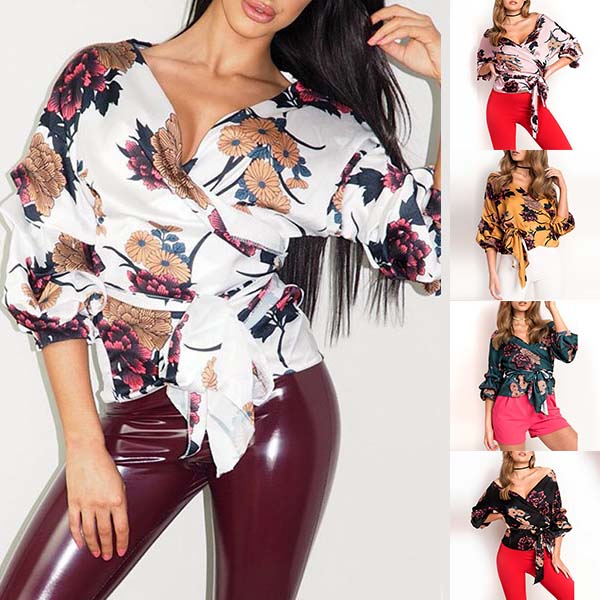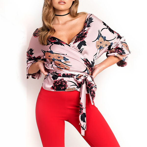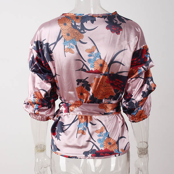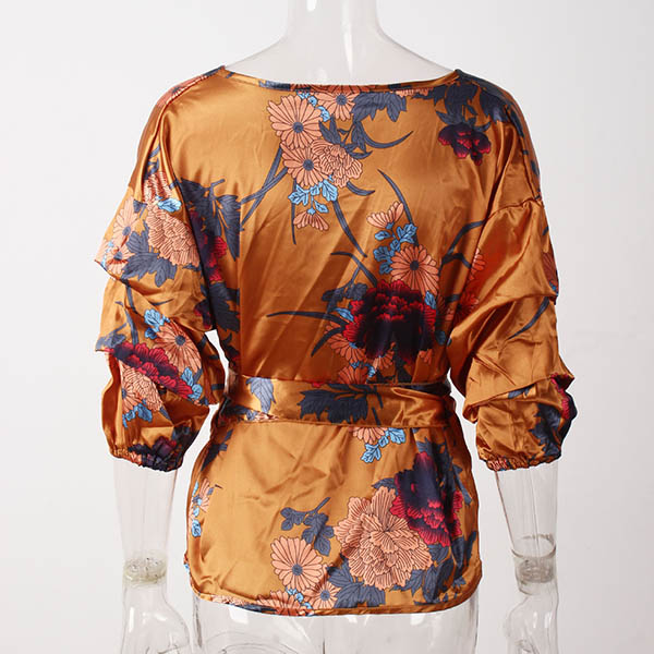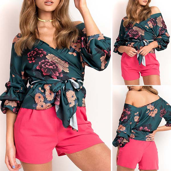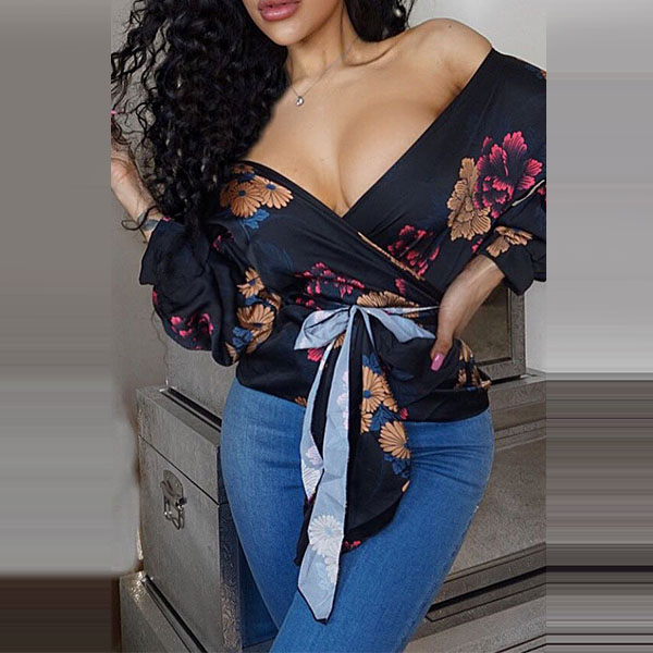 Sexy Deep V-neck Contrast Color Short Sleeve Bandaged Printed Pattern Shirt
