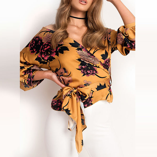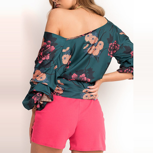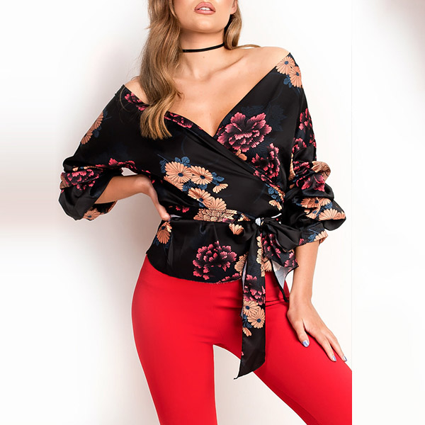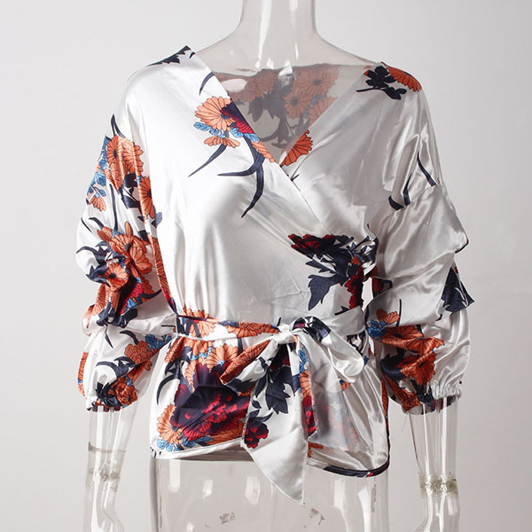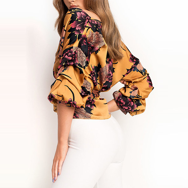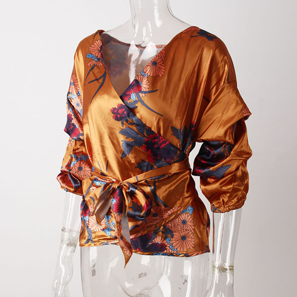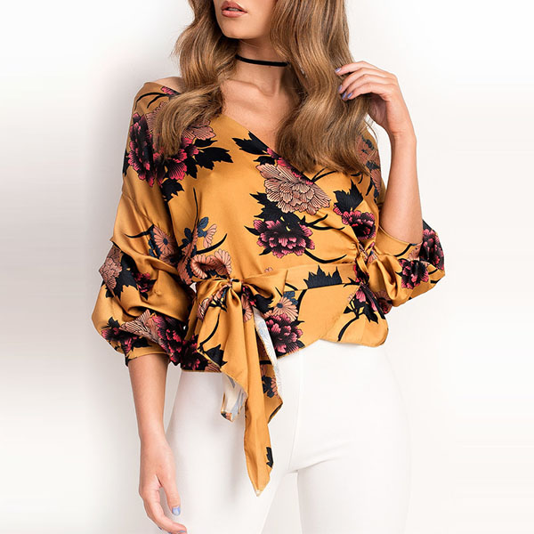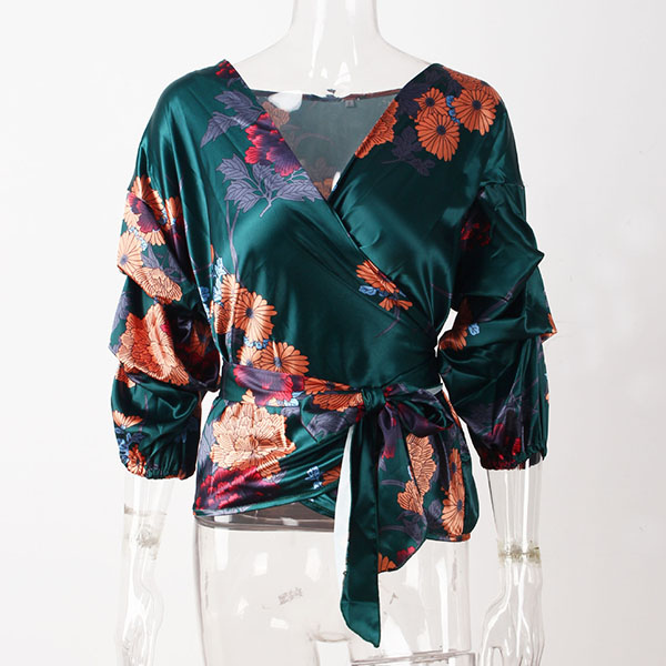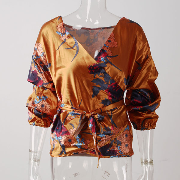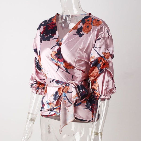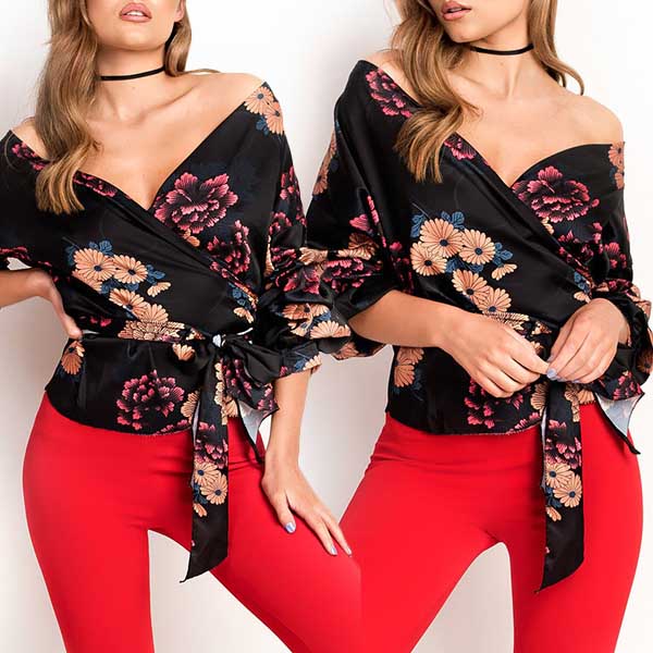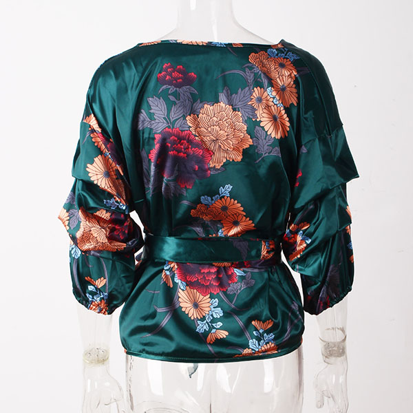Sexy Deep V-neck Contrast Color Short Sleeve Bandaged Printed Pattern Shirt