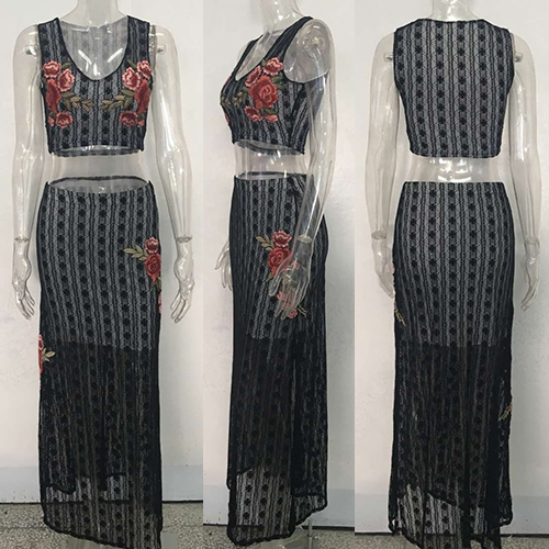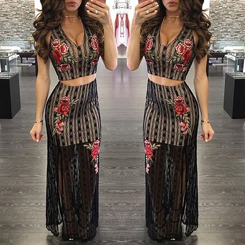 deep v-neck crop top and a high waist slit hem skirt,with embroidered details make it more gorgeous and appealing.
