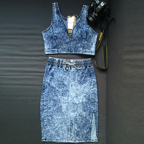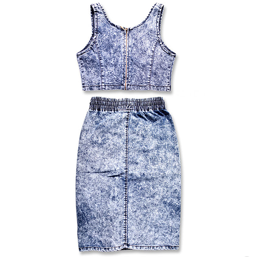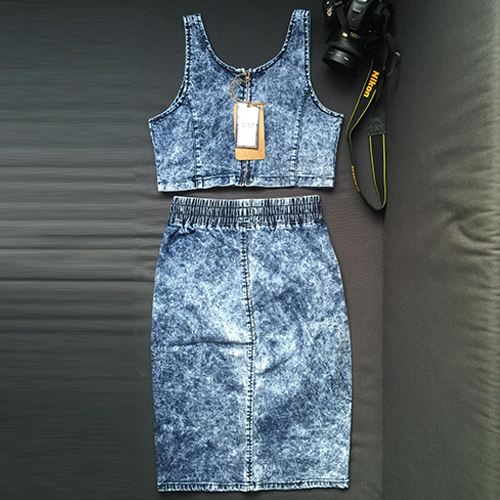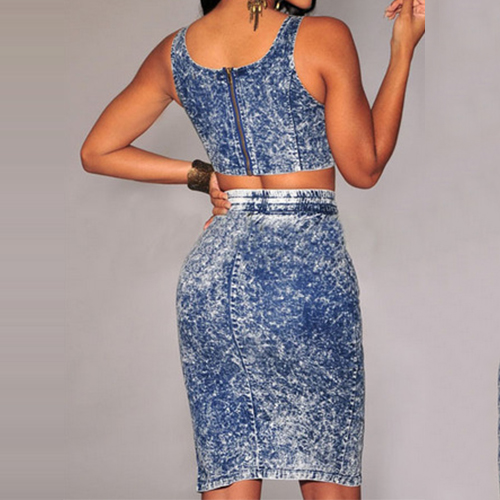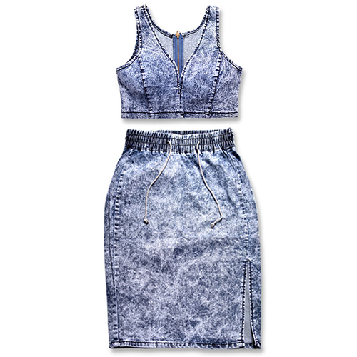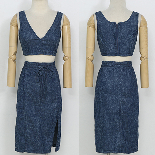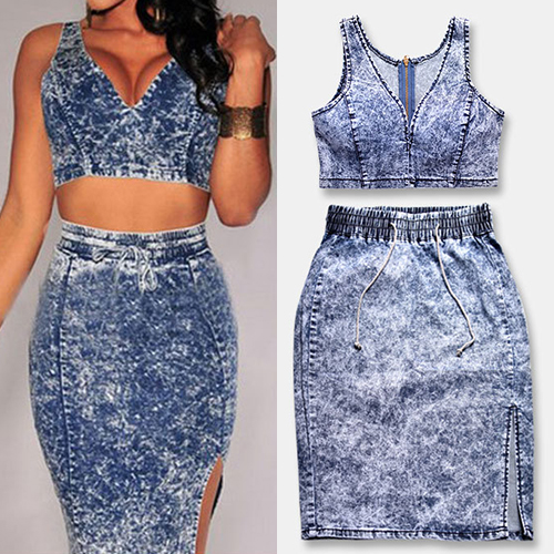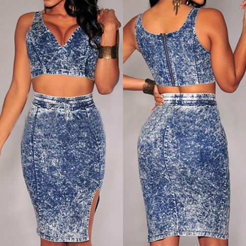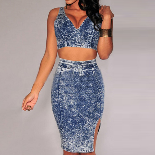 Crafted from stretch and breathable fabric,including a sleeveless deep v-neckline crop tops and a high waist slit hem bust skirtthis denim two-piece set is sure to give you a sexy and sultry style. Seductive appeal comes easily once you wear this two-piece set.