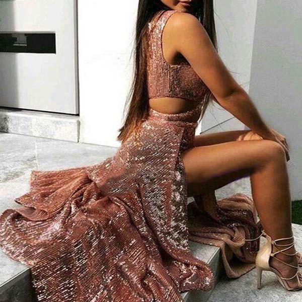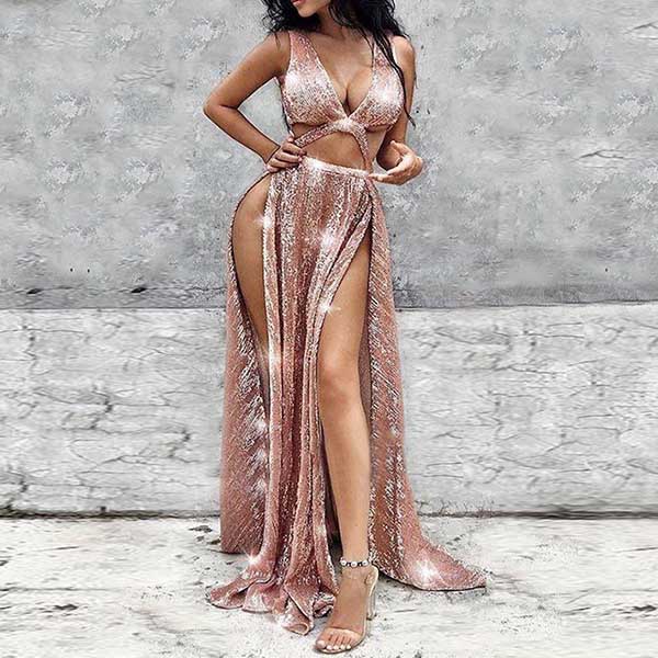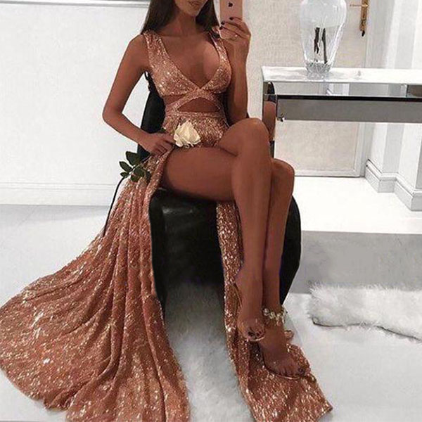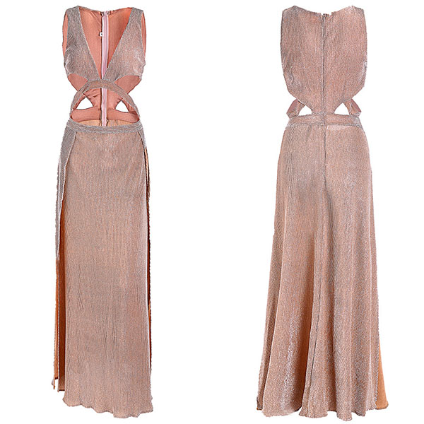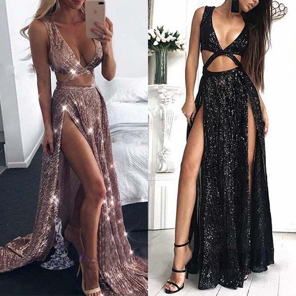 a high slit dress hemline and a back zipper closure. Just need a pair of shining high heel,