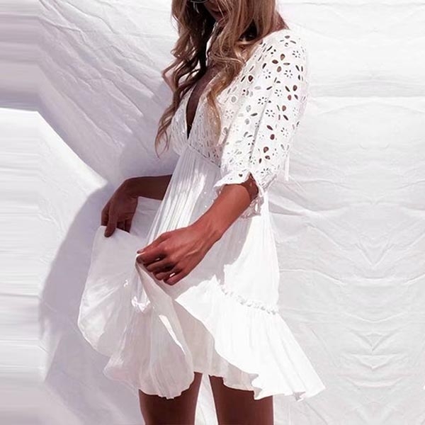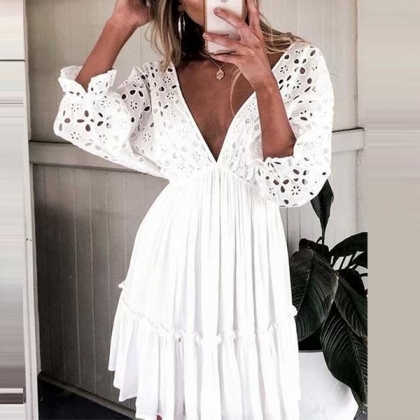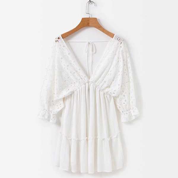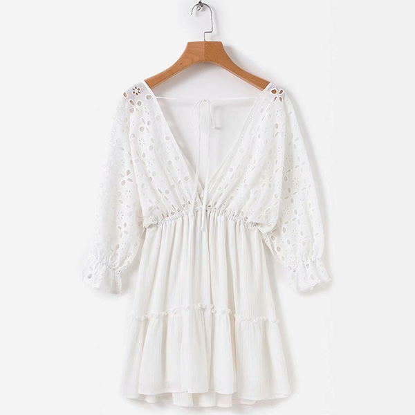 silhouette with soft fabric, feature a hollow out lace spliced bodice with deep V-neck at the front and back for