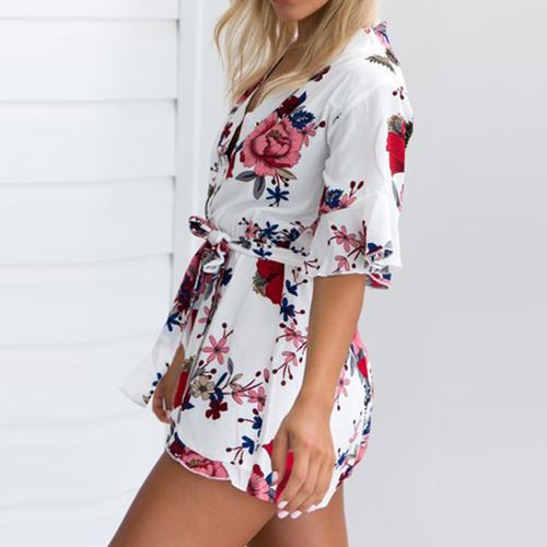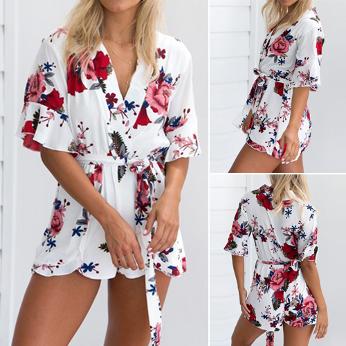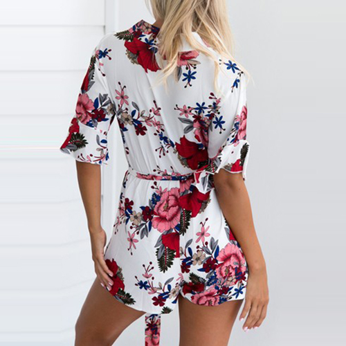 a vibrant floral print,with deep v-neckline,half sleeve and cozy fabric,this romper is a perfect combination of style and comfort.