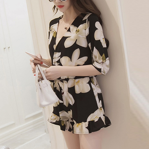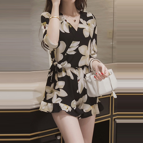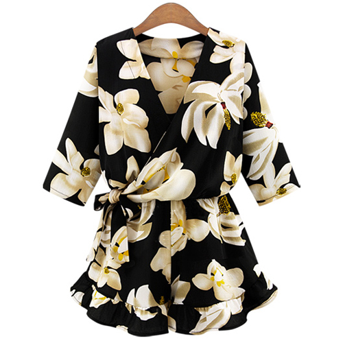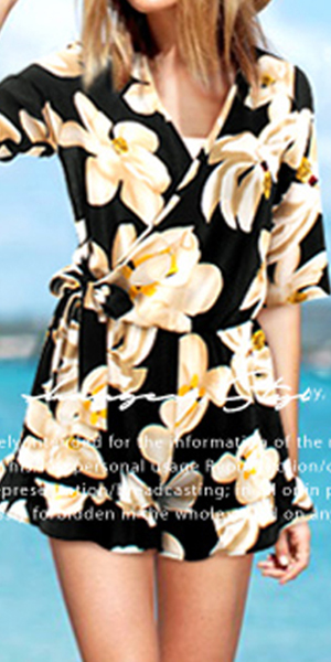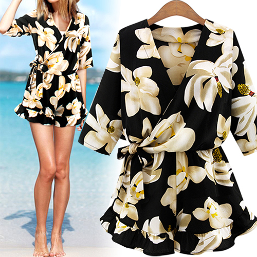 a sweet and vibrant floral print,with a deep v-neckline and half sleeve design,this romper is a perfect way