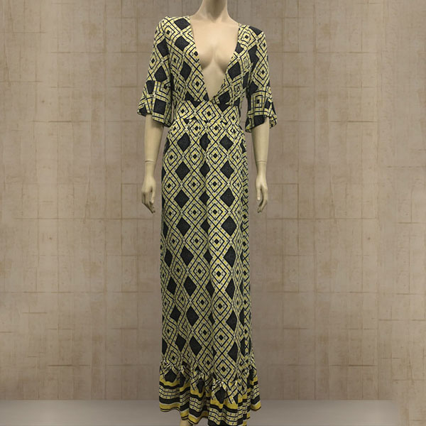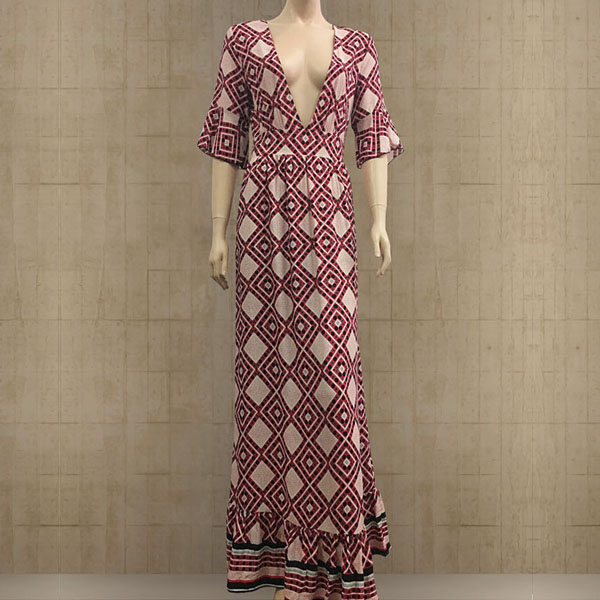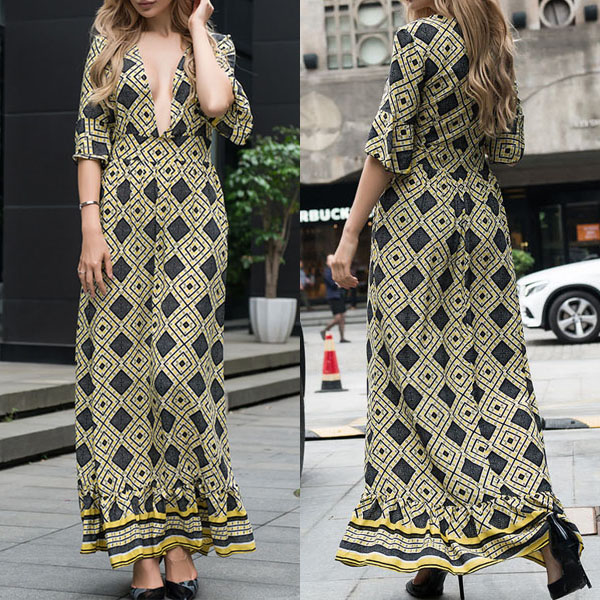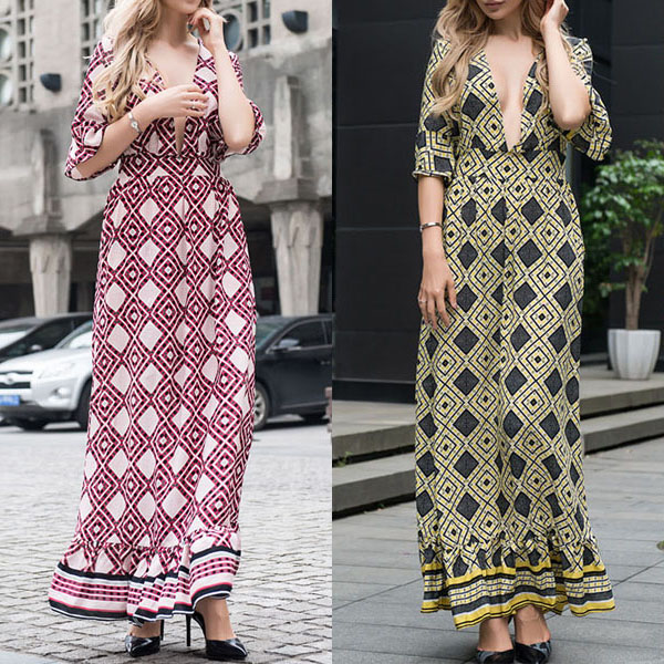 Features chic printed pattern,accompanied with half sleeve,deep v-neck and ruffle hem,sexy and charming.