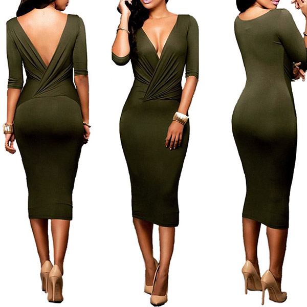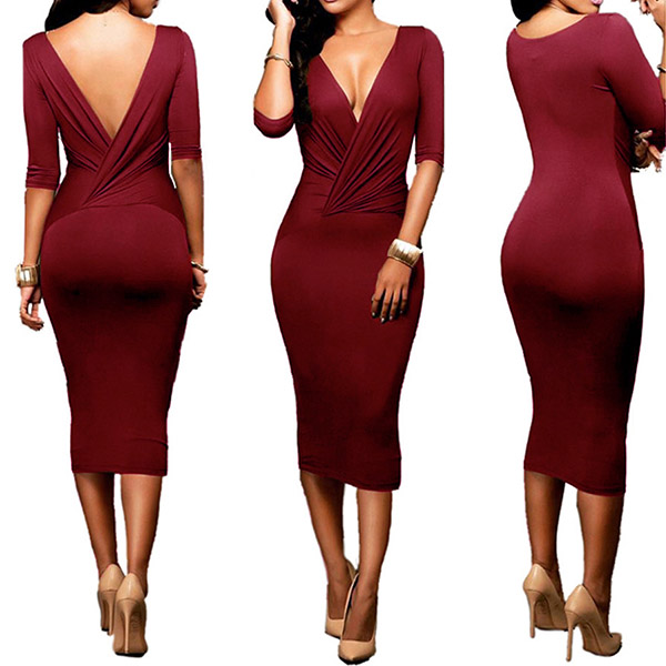 Solid color style,finished with half sleeve,deep v-neck and a tight silhouette,this dress can showcase