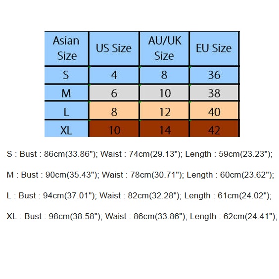XL : Bust : 98cm(38.58"); Waist : 86cm(33.86"); Length : 62cm(24.41");