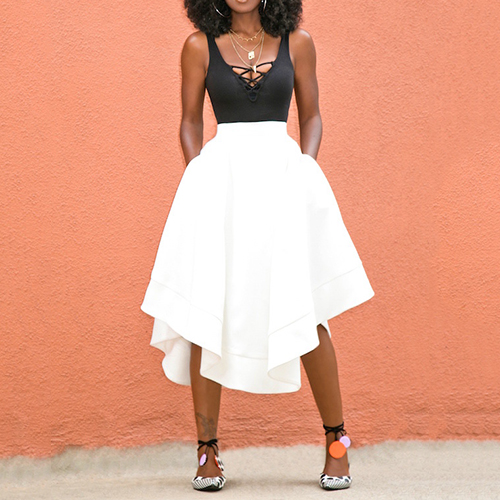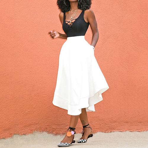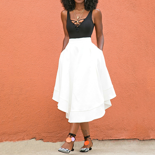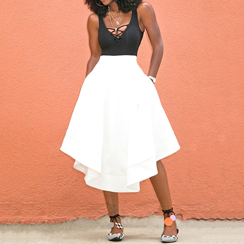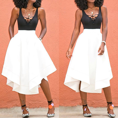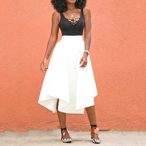 The perfect collocation of black tops and white dress makes this set more perfect. Hollow out style,