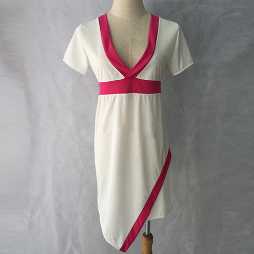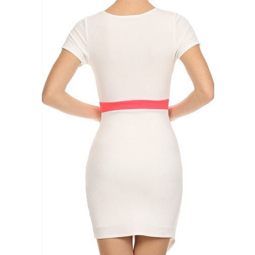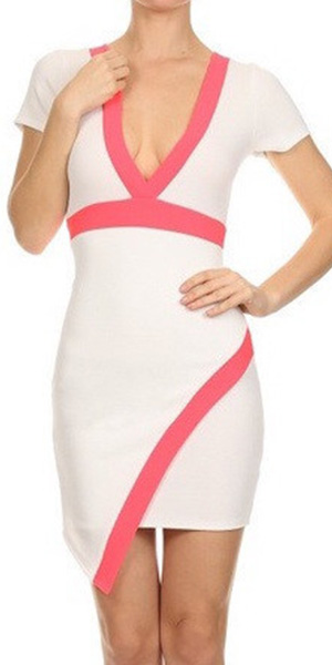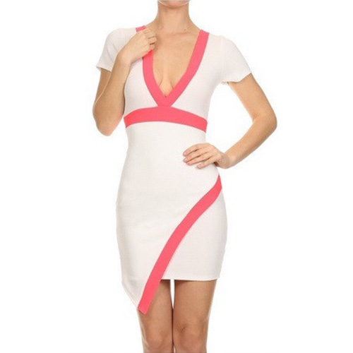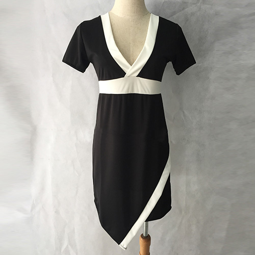 This dress features contrast color style,with deep v-neck,short sleeve and irregular hemline design,