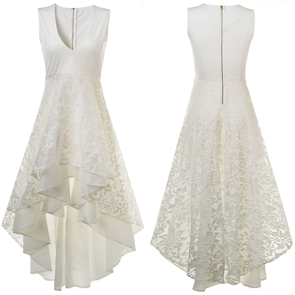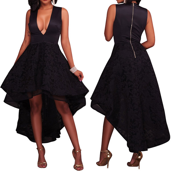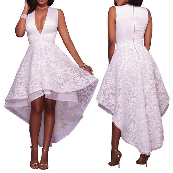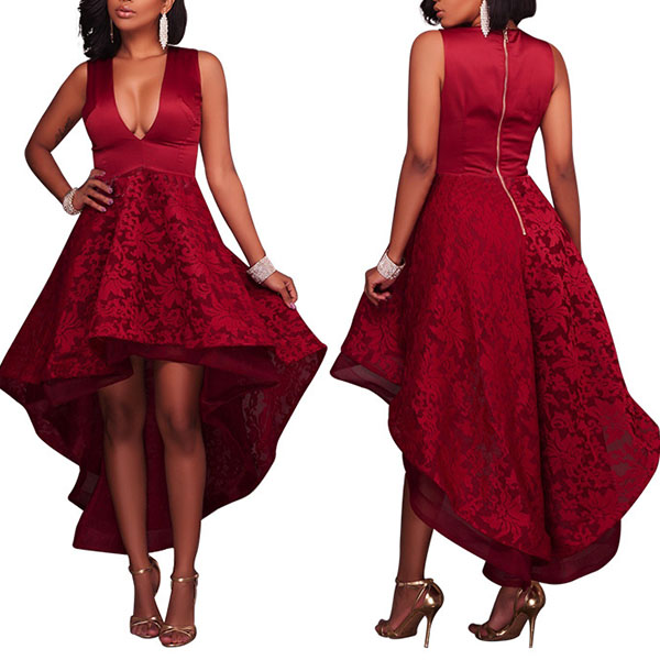 parties or wedding receptions. It is styled with sleeveless,deep v-neck and lace spliced high-low hem,