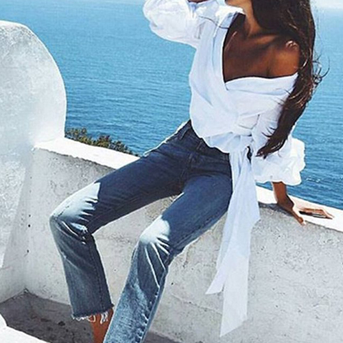 with a deep v-neckline,lantern sleeve and crossover lace-up details,this piece can give you an